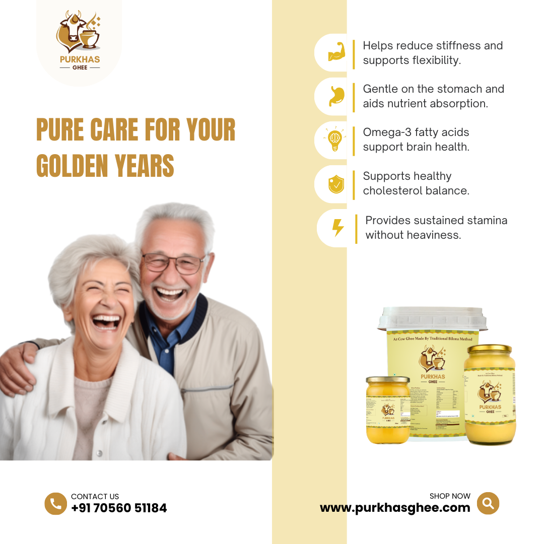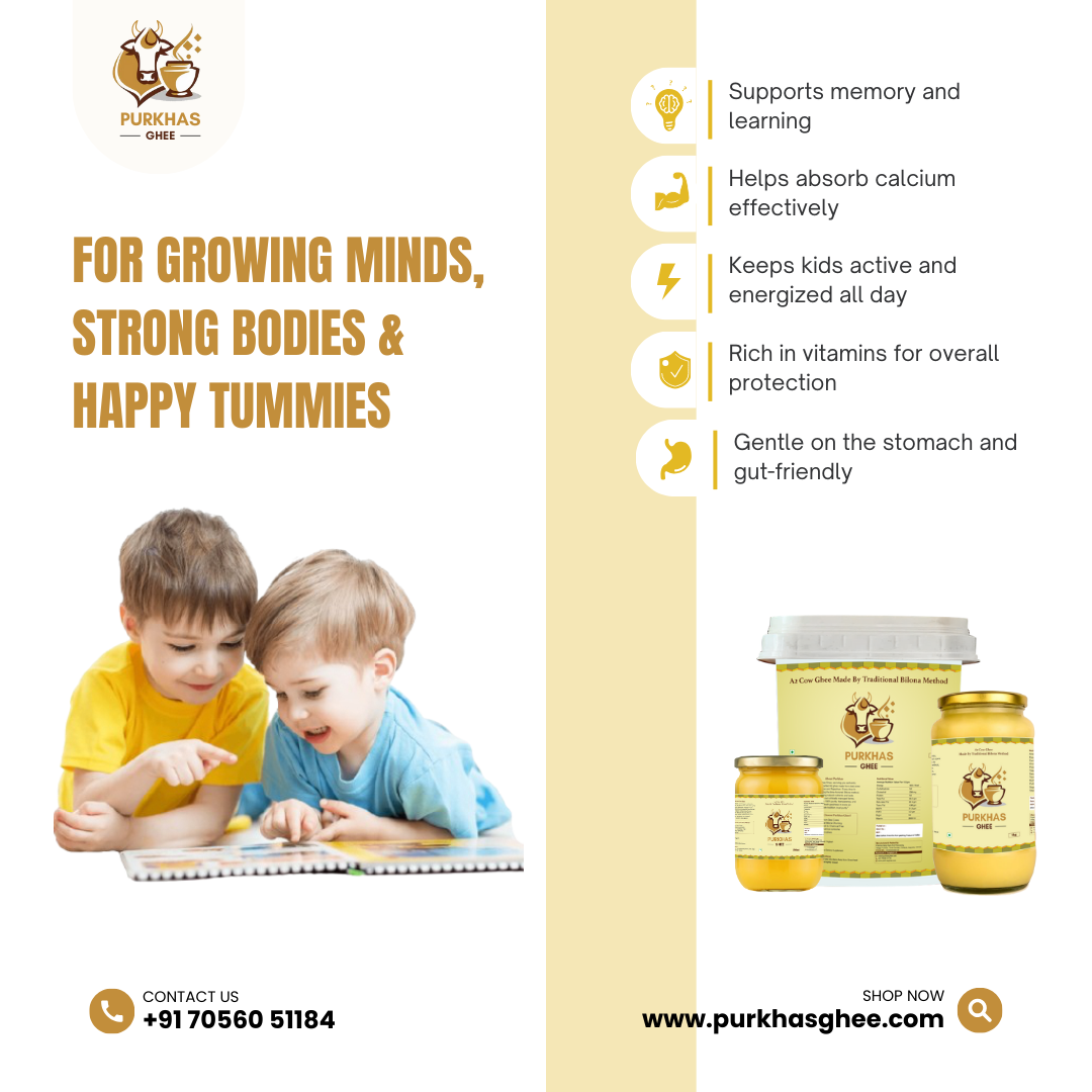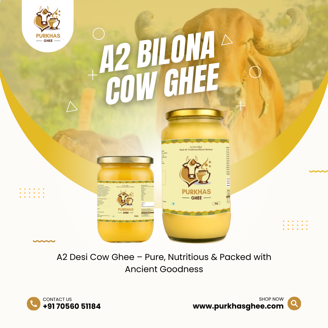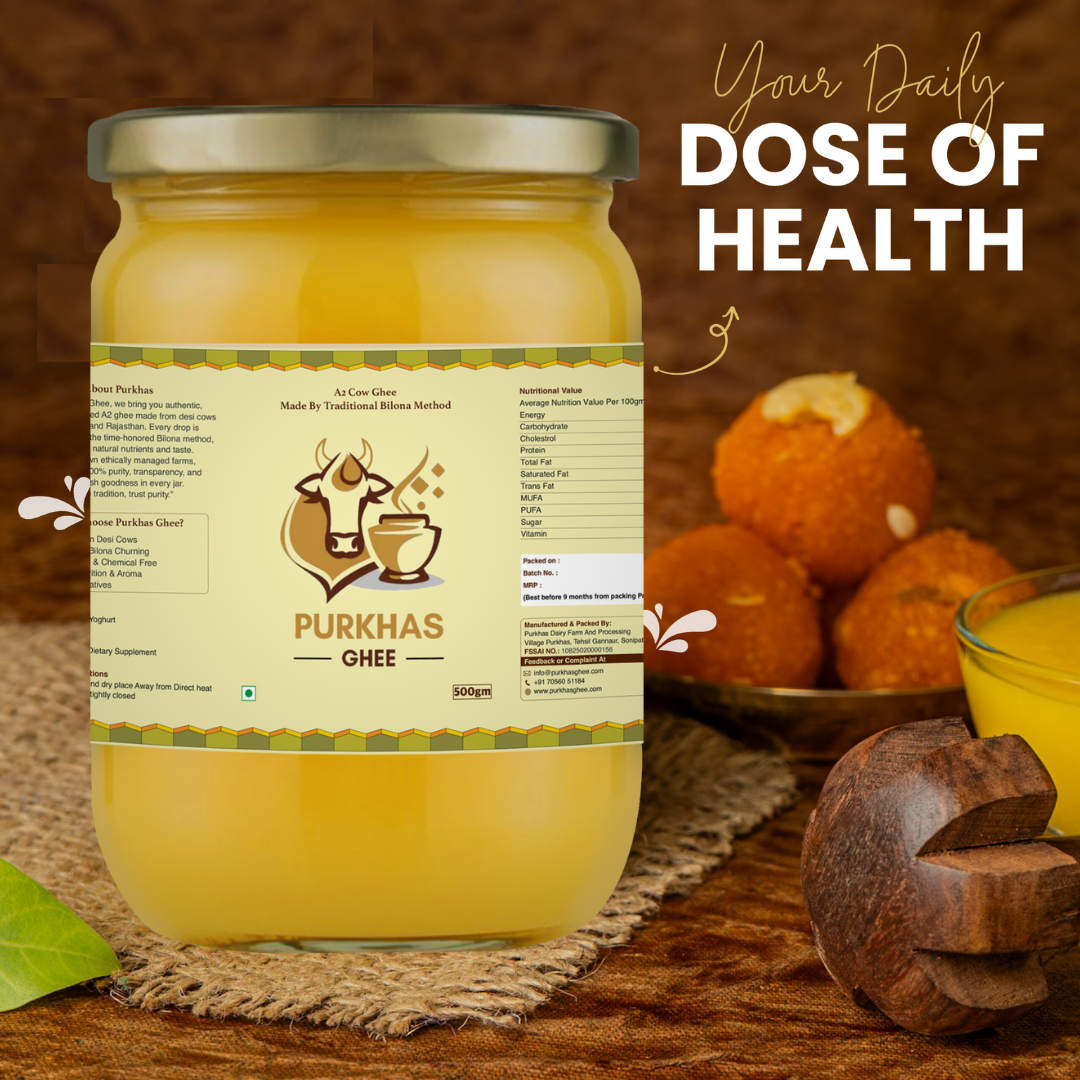 Purkhaas Ghee is crafted using the time-honored bilona method, rooted in the rich traditions of Haryana and Rajasthan. Made from pure desi cow's milk, it delivers authentic taste, unmatched purity, and the wholesome goodness of our ancestral heritage.